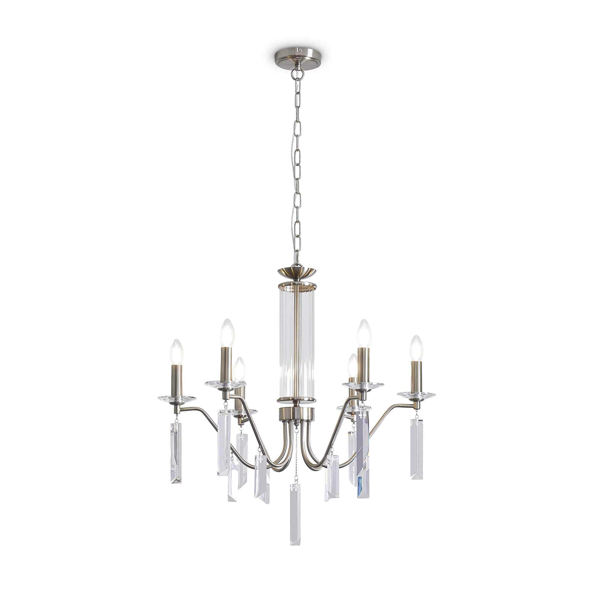 Материал арматуры — металл, цвет — никель или латунь. Подвесные светильники с цоколем E14. Доступны с пятью или шестью источниками света. Грани хрустальных подвесов создают эффект перелива радуги. Центральный декор из стеклянных трубок. Подходит для классических интерьеров.