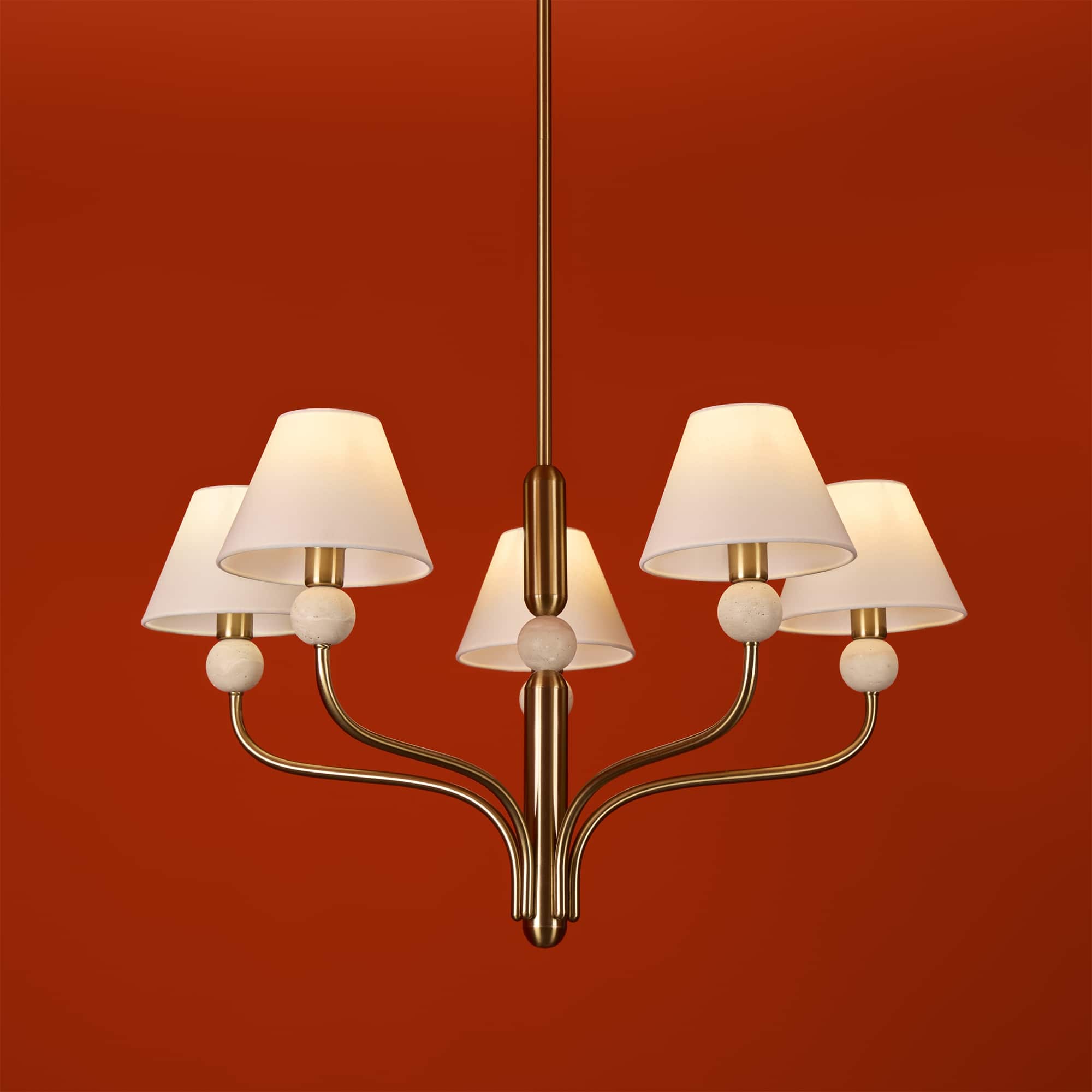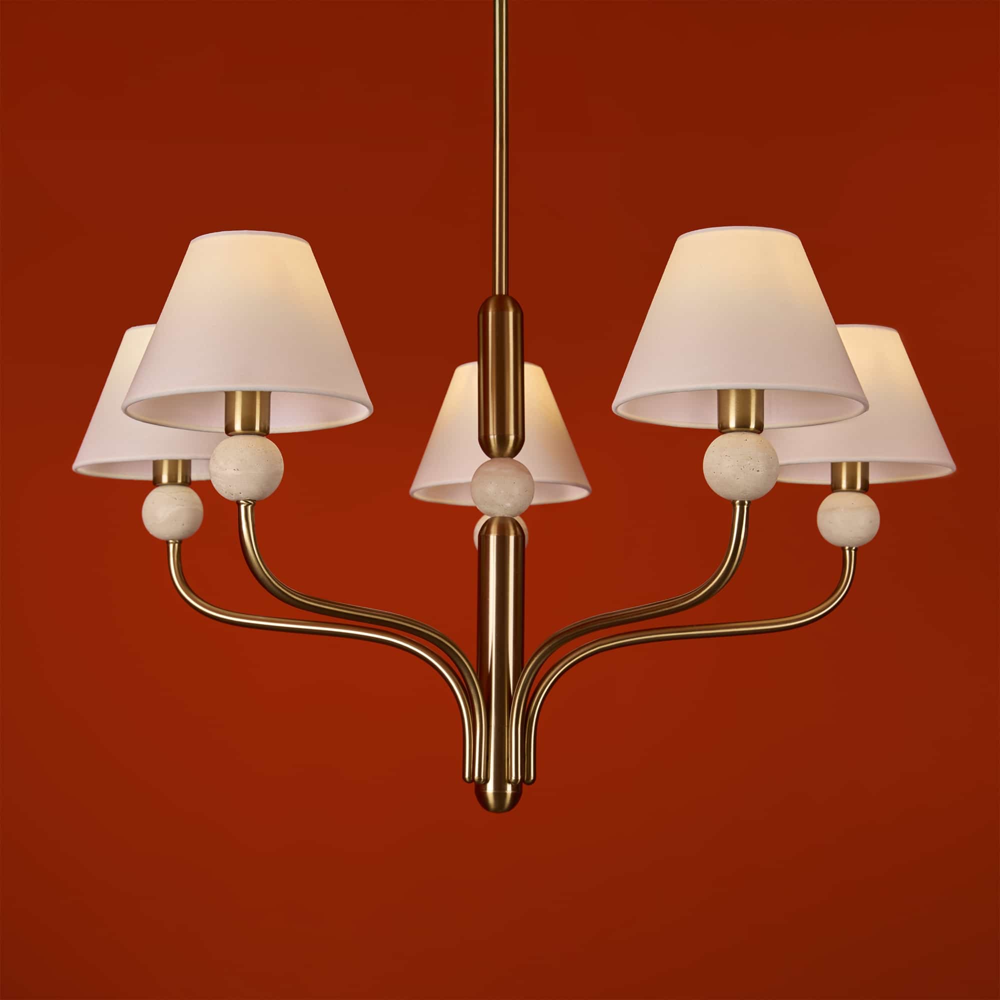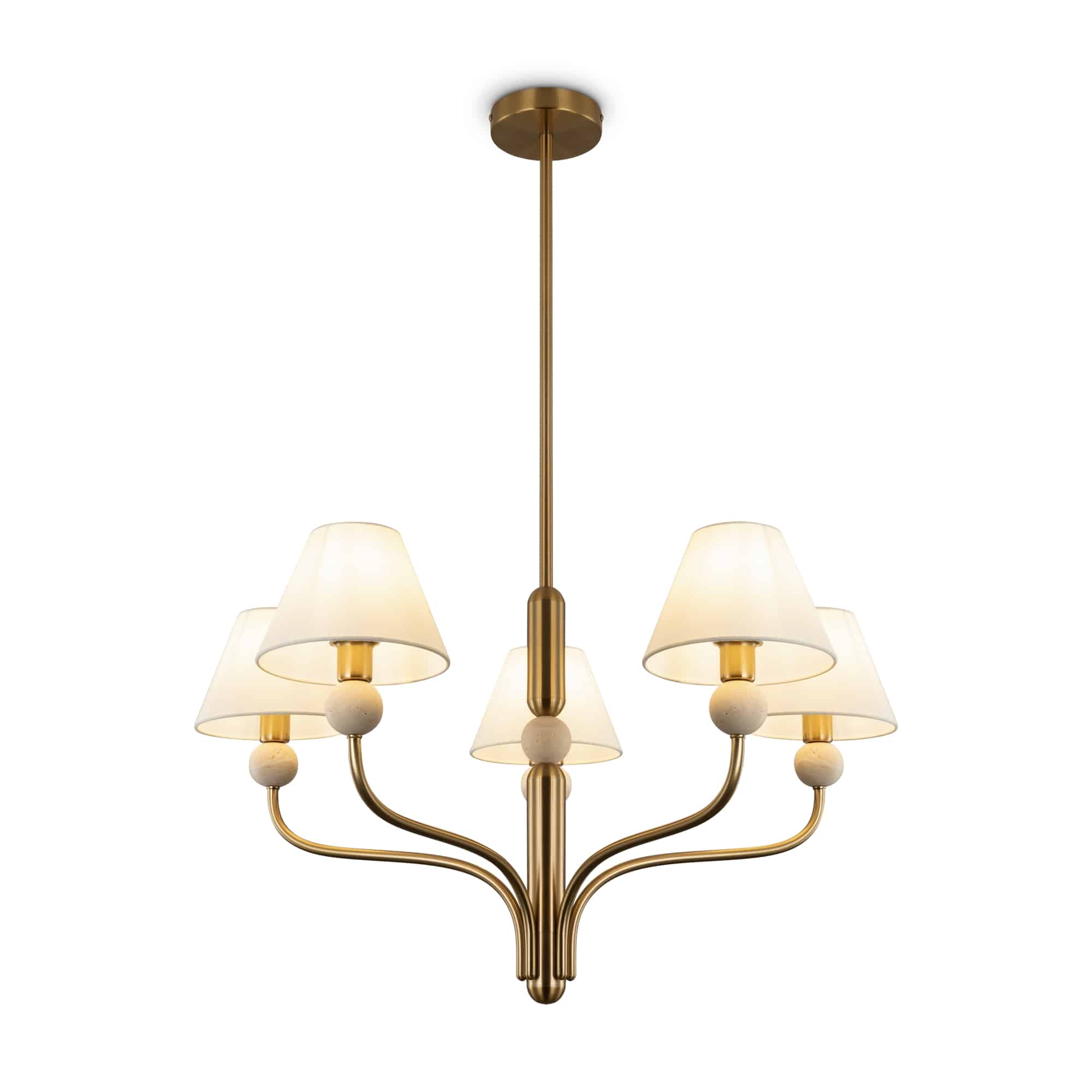 Арматура — металл в цвете латунь. Тканевые абажуры, травертиновые элементы. Лампы E14 (в комплекте). Серия состоит из люстры c 5 плафонами и бра. Трендовое сочетание в классическом стиле.