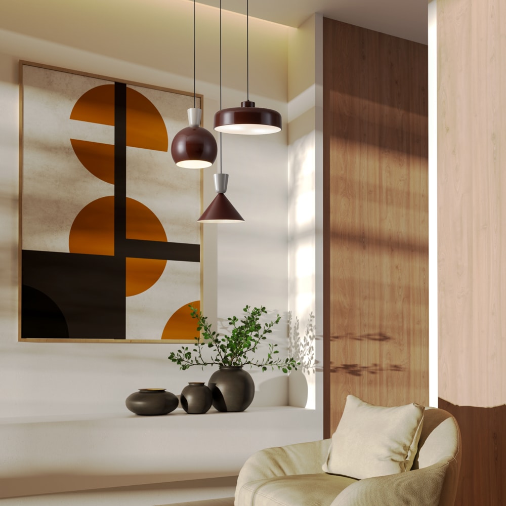 Материал арматуры — металл, цвет абажура —глубокий бордовый и нежно кремовый. Три уникальные формы плафонов с цоколем E27/E14 (лампы в комплекте). Минималистичный дизайн с динамикой света.