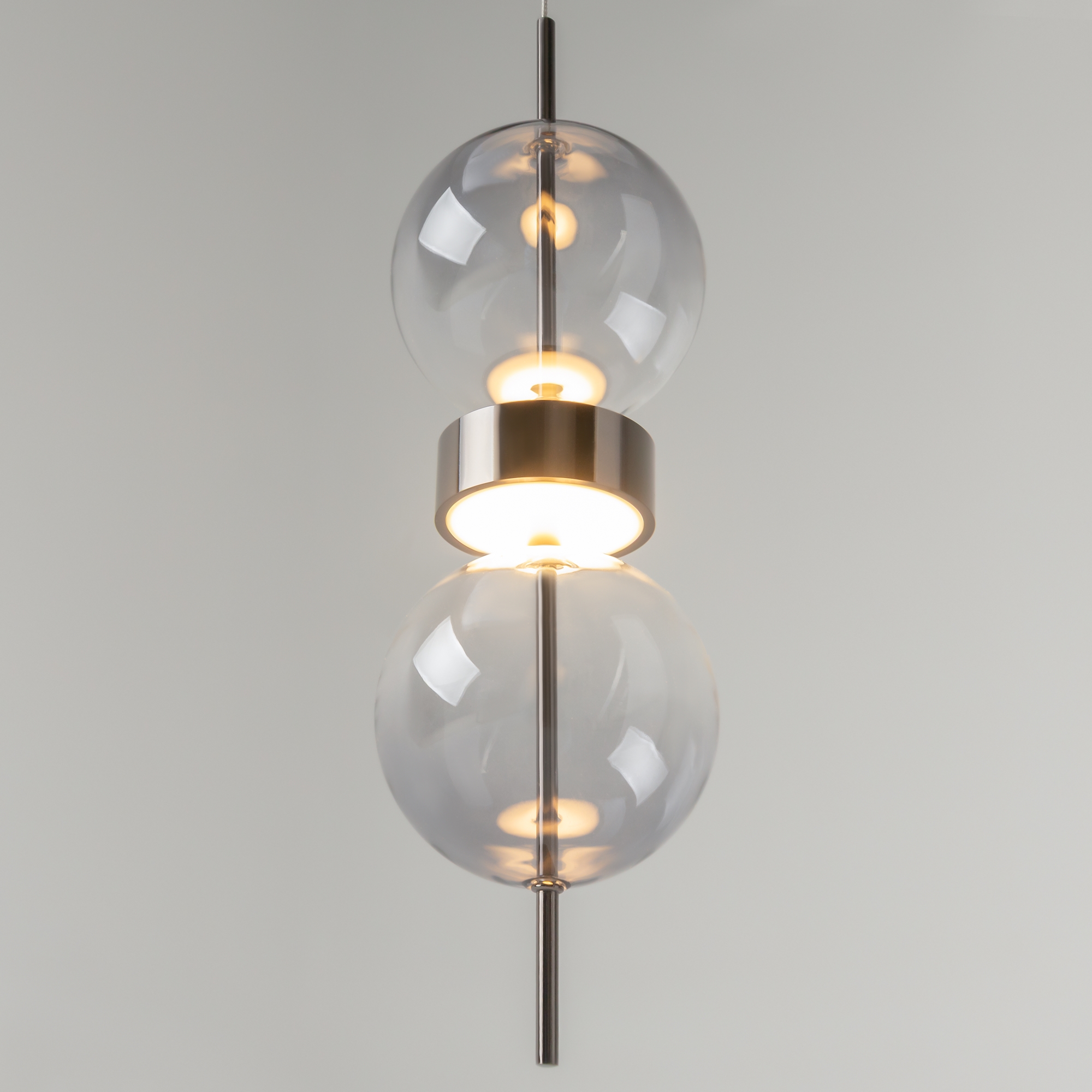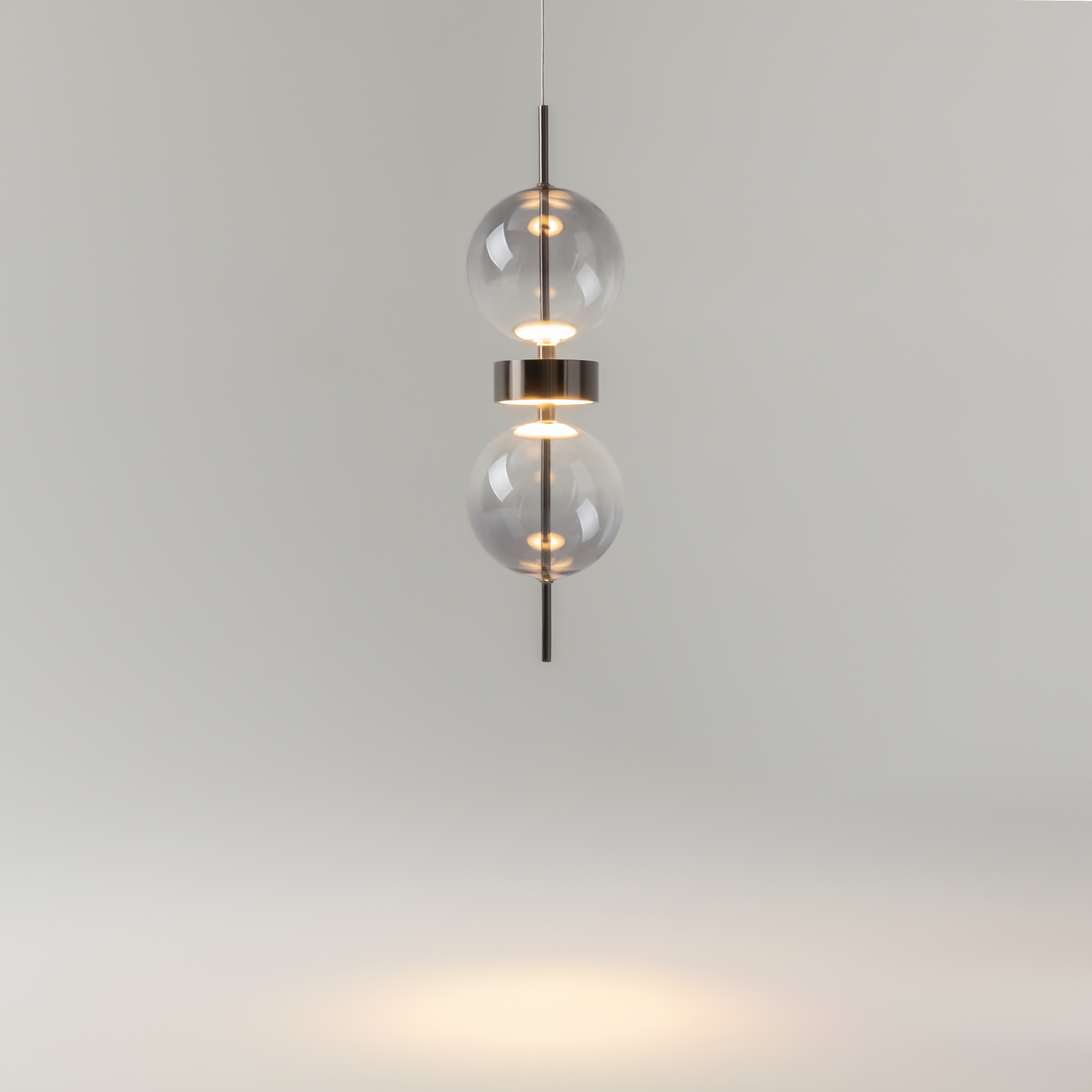 Серия включает подвесной светильник, бра, напольный и портативную модели. Стеклянные плафоны с зеркальным градиентом, черная глянцевая арматура из металла. LED-источник (3000K) скрыт матовым рассеивателем. Конструктивные особенности: магнитные потолочные чаши у подвесов и магнитное основание у бра обеспечивают монтаж без видимого крепежа. Напольный и аккумуляторный светильники диммируются при длительном удержании кнопки. Серия отмечена премиями Red Dot и A’design за инновационный дизайн.