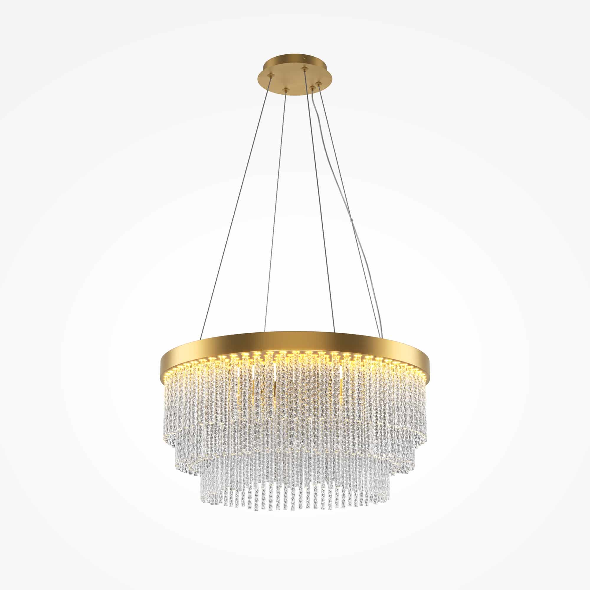 Арматура выполнена из металла в цвете латуни с легким мерцающим финишем. Декоративные элементы: стеклянные трубочки с витиеватым орнаментом, игриво переотражающим свет. Встроенный LED-источник, создающий свет достаточный для основного освещения. Трехступенчатый переключатель позволяет выбирать цветовую температуру: 2700K, 3000K или 4000K. Высота светильника регулируется, максимальная высота — 3300 мм. Высокий индекс цветопередачи CRI >90. Создает изысканное освещение с игрой бликов и переотражений.