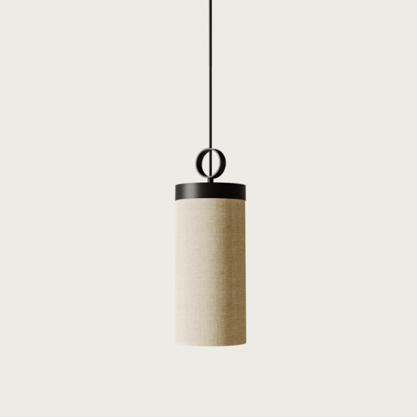 Подвесной светильник, выполненный из металла в черной отделке и абажуром из натурального льна.