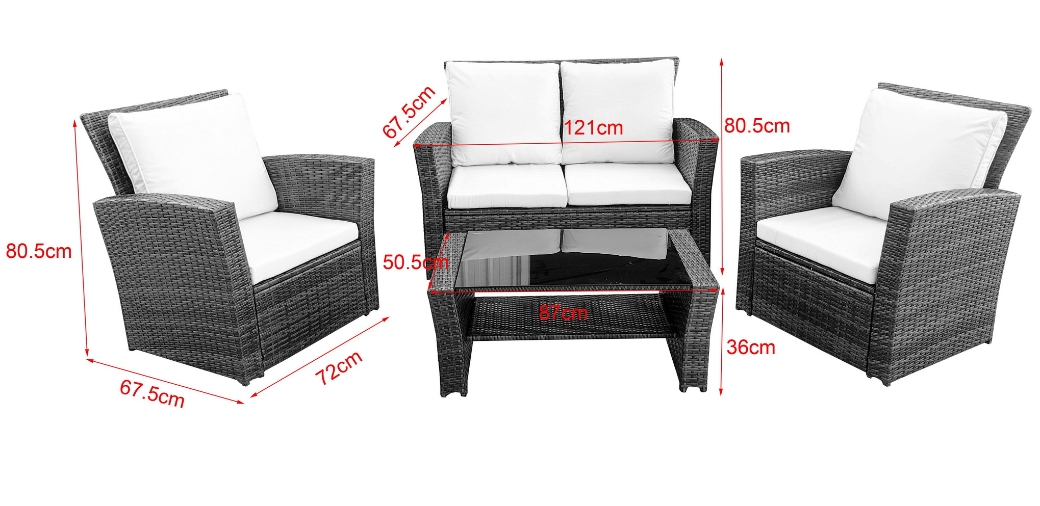 В основе мебели — стальной каркас и плоский искусственный ротанг. Каркас оплетен с помощью ручного метода и представлен в сером цвете.