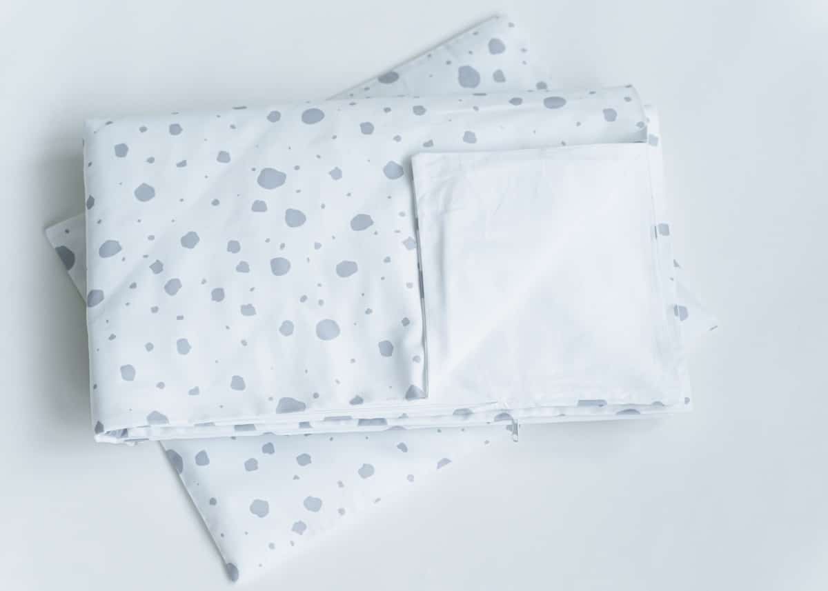 Постельное бельё в детскую кроватку. Состав: наволочка 40*32 см, пододеяльник 90*110 см (пятнышки серые, сатин)