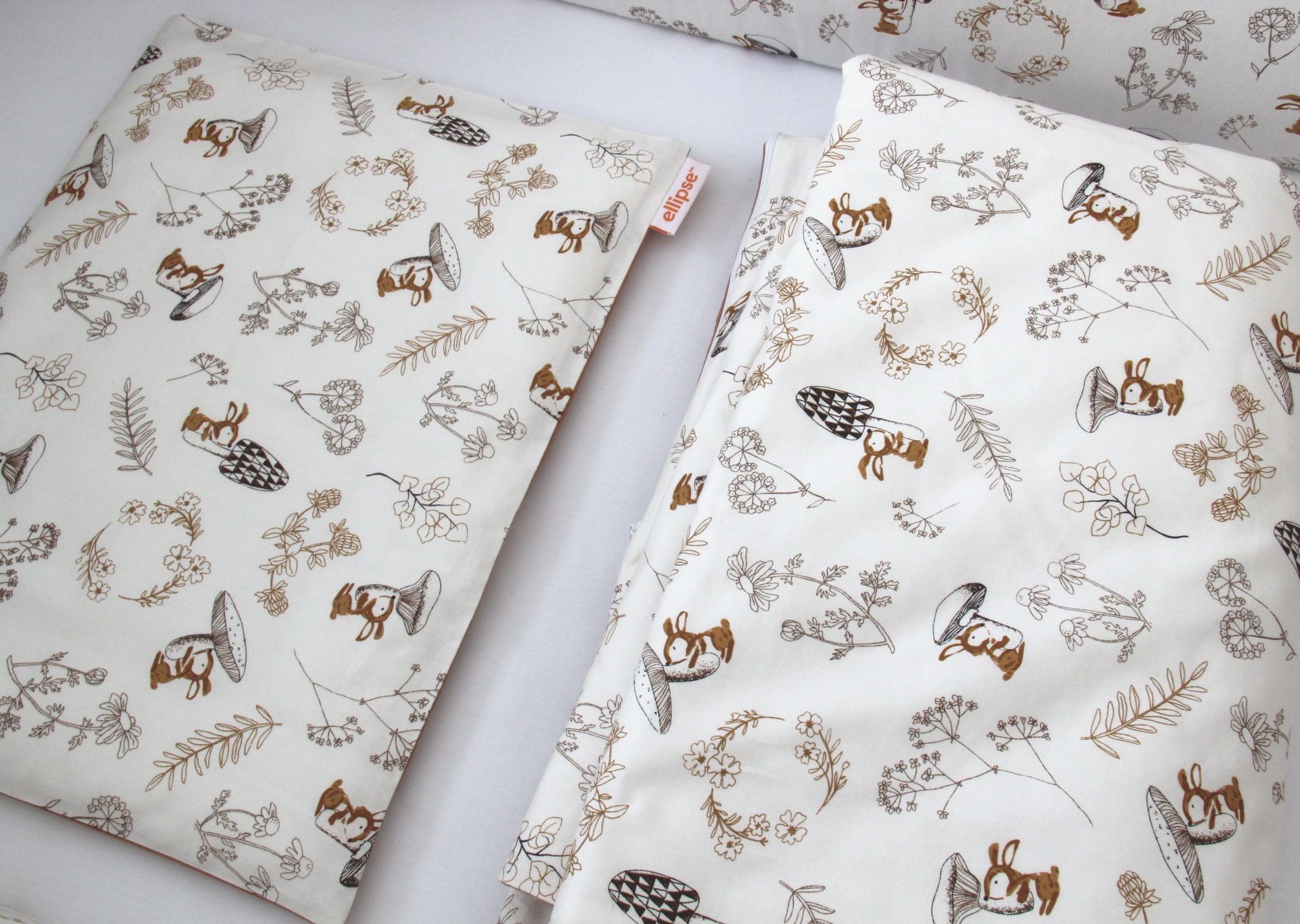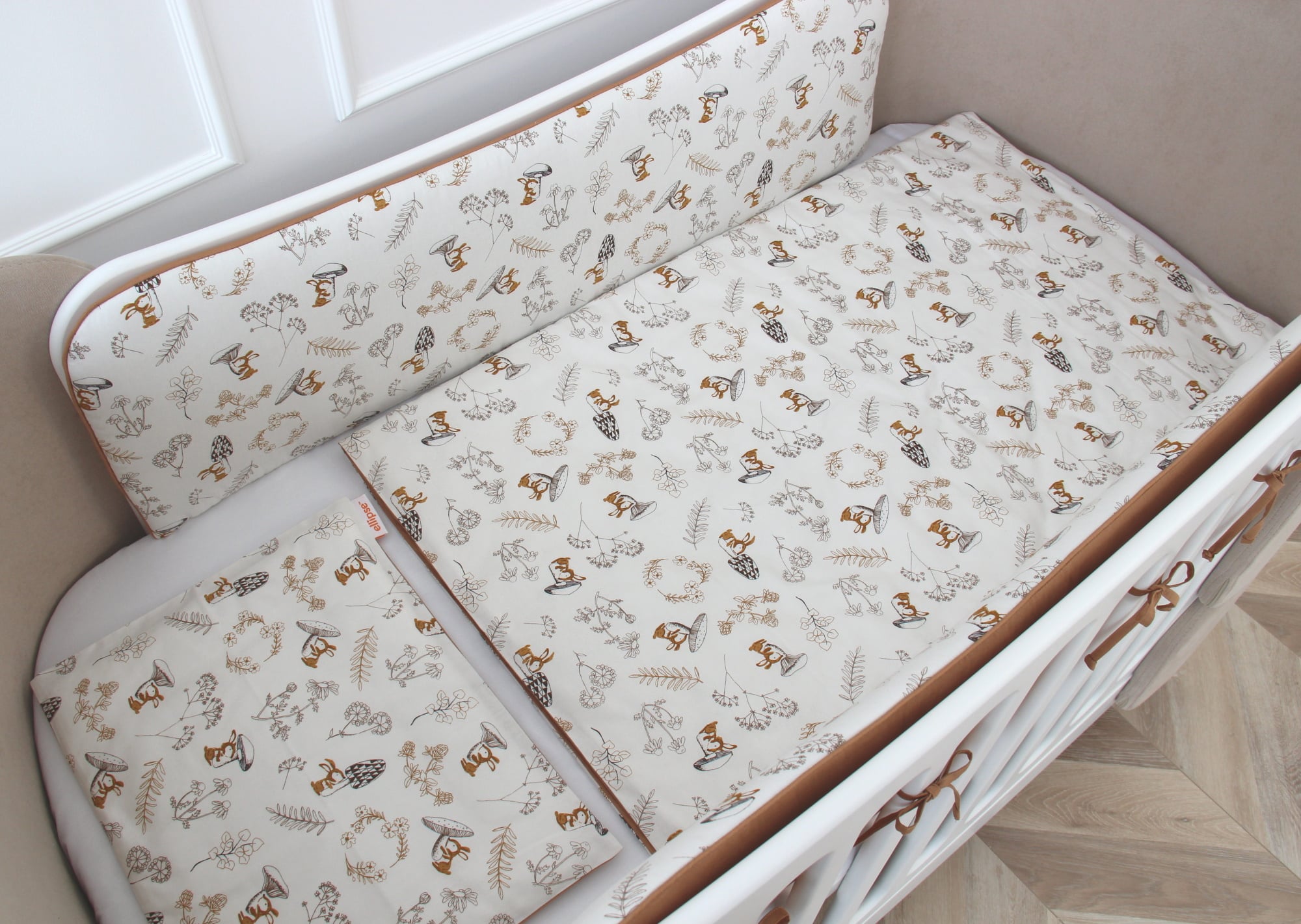 Постельное бельё в детскую кроватку. Состав: наволочка 40*32 см, пододеяльник 90*110 см «Зайчики с грибами» (мокко, сатин)