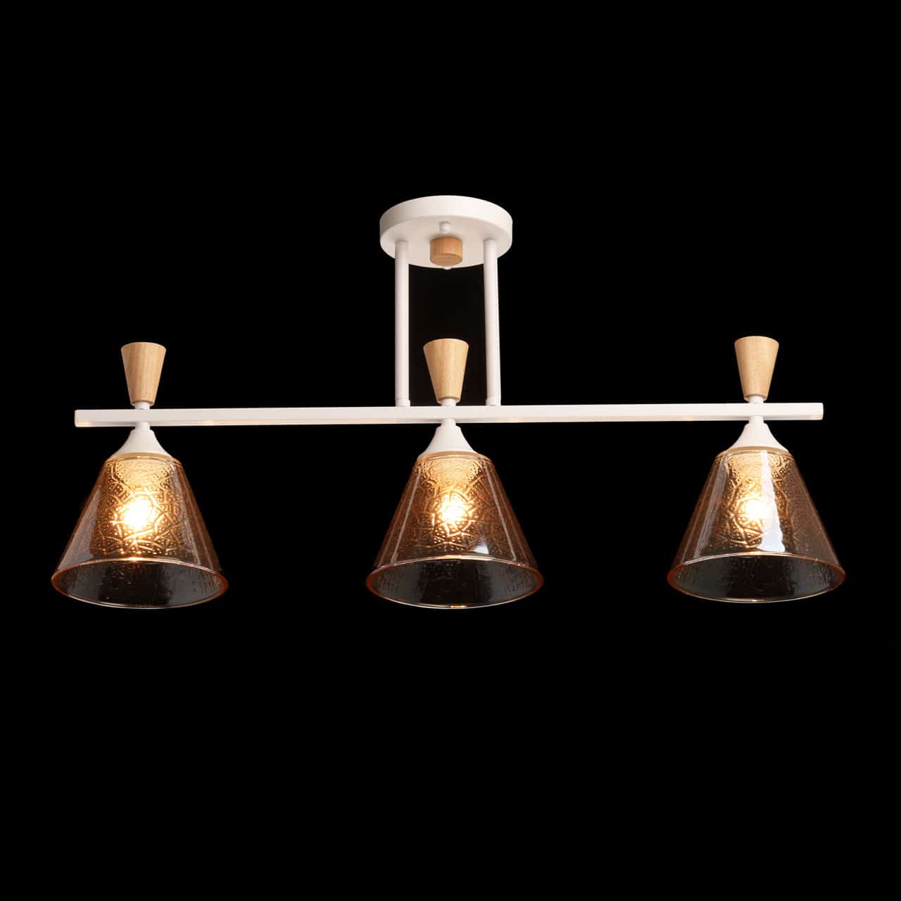 Металлическое основание потолочной люстры окрашено в белый цвет. Стеклянные плафоны отлиты в фактурную форму и гальванизированы в цвет коньяка. Потолочная люстра декорирована элементами из светлого натурального дерева.