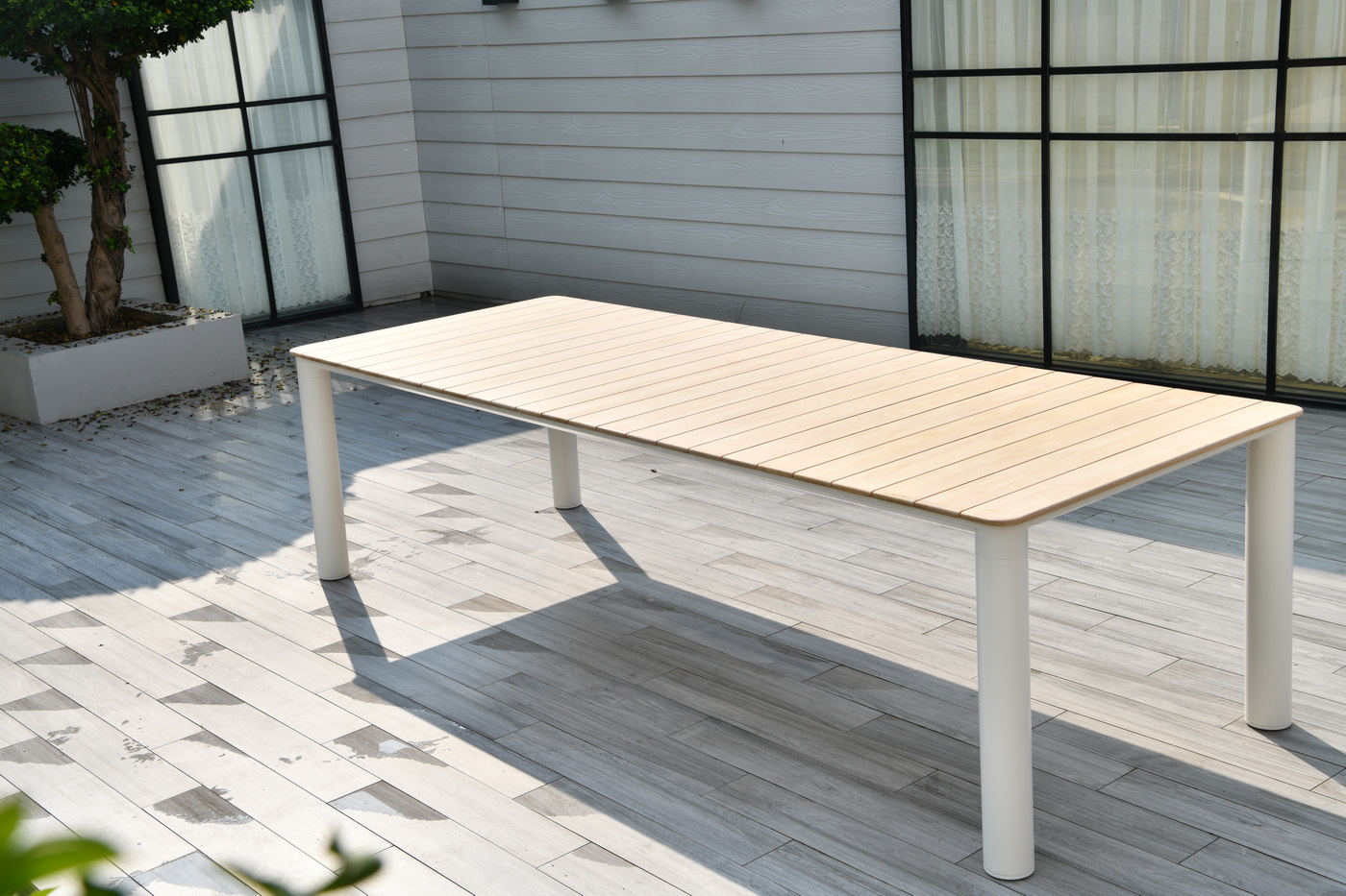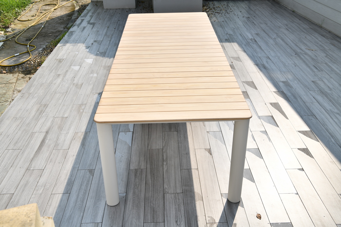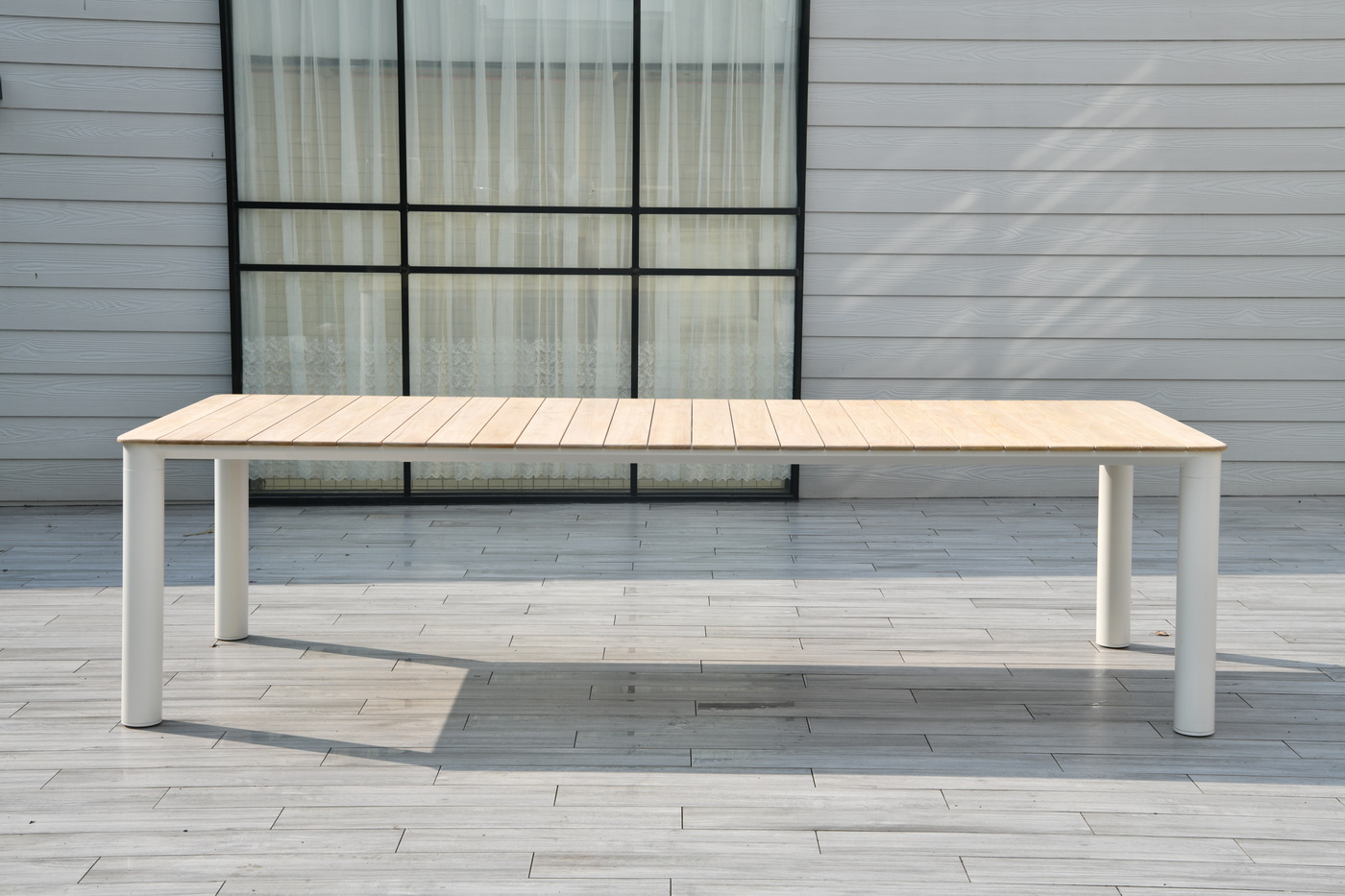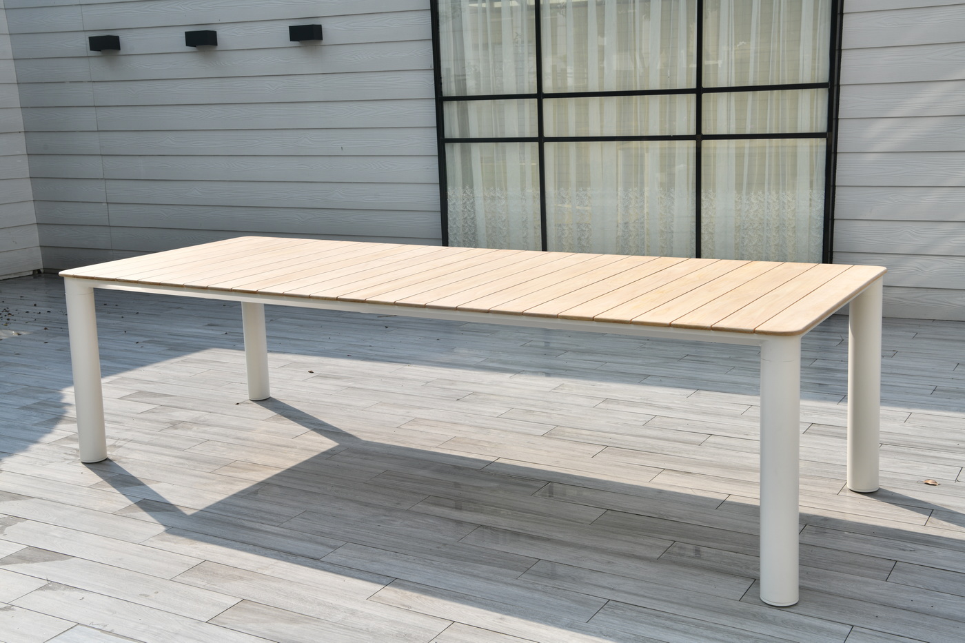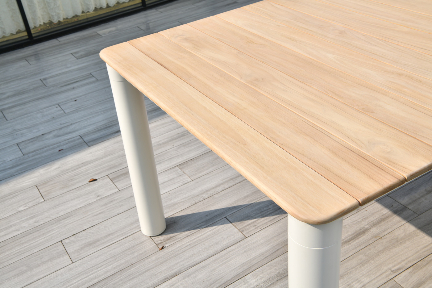 Обеденный стол «Прага» с тиковой столешницей и алюминиевым каркасом — сочетание природной эстетики и современных инженерных решений.