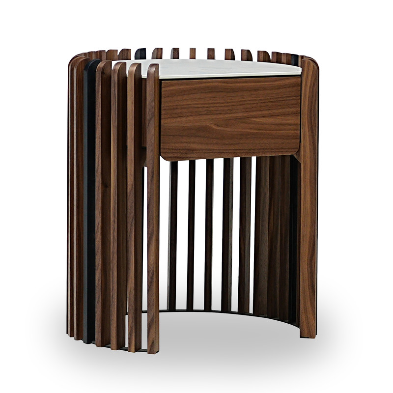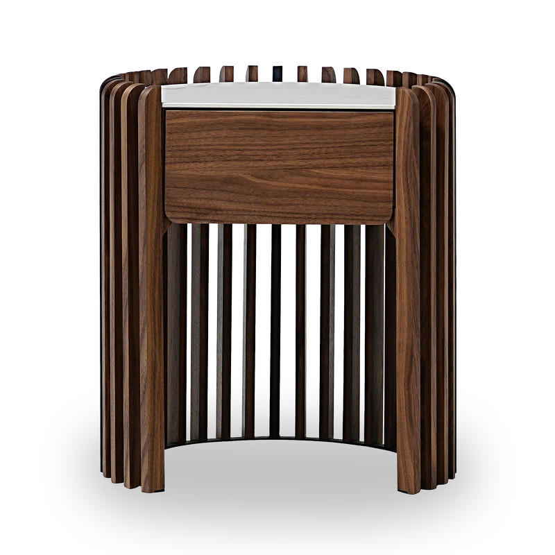 Дизайн строится на контрасте текстур: теплая, тактильно приятная поверхность шпона американского ореха сочетается с холодной гладкостью и благородством белой керамической столешницы.