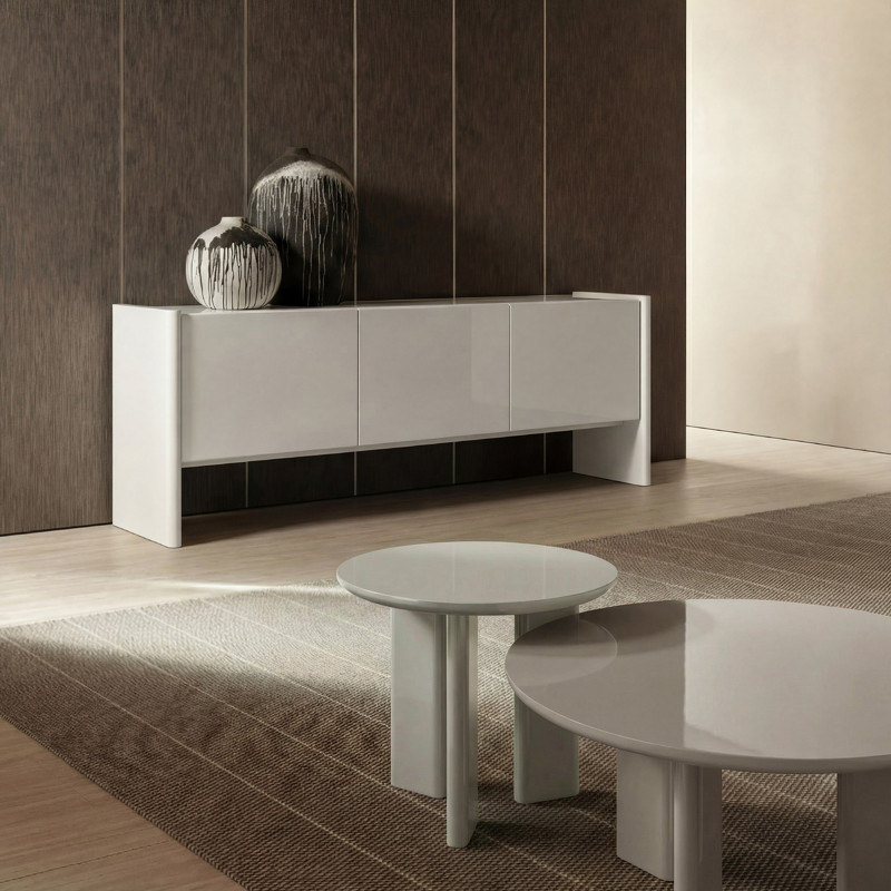 Столик выполнен из высококачественного МДФ стандарта Е1, сочетает в себе прочность и элегантность. Его гладкая поверхность, покрытая полиуретановым глянцевым лаком светло-бежевого оттенка, притягивает взгляд.