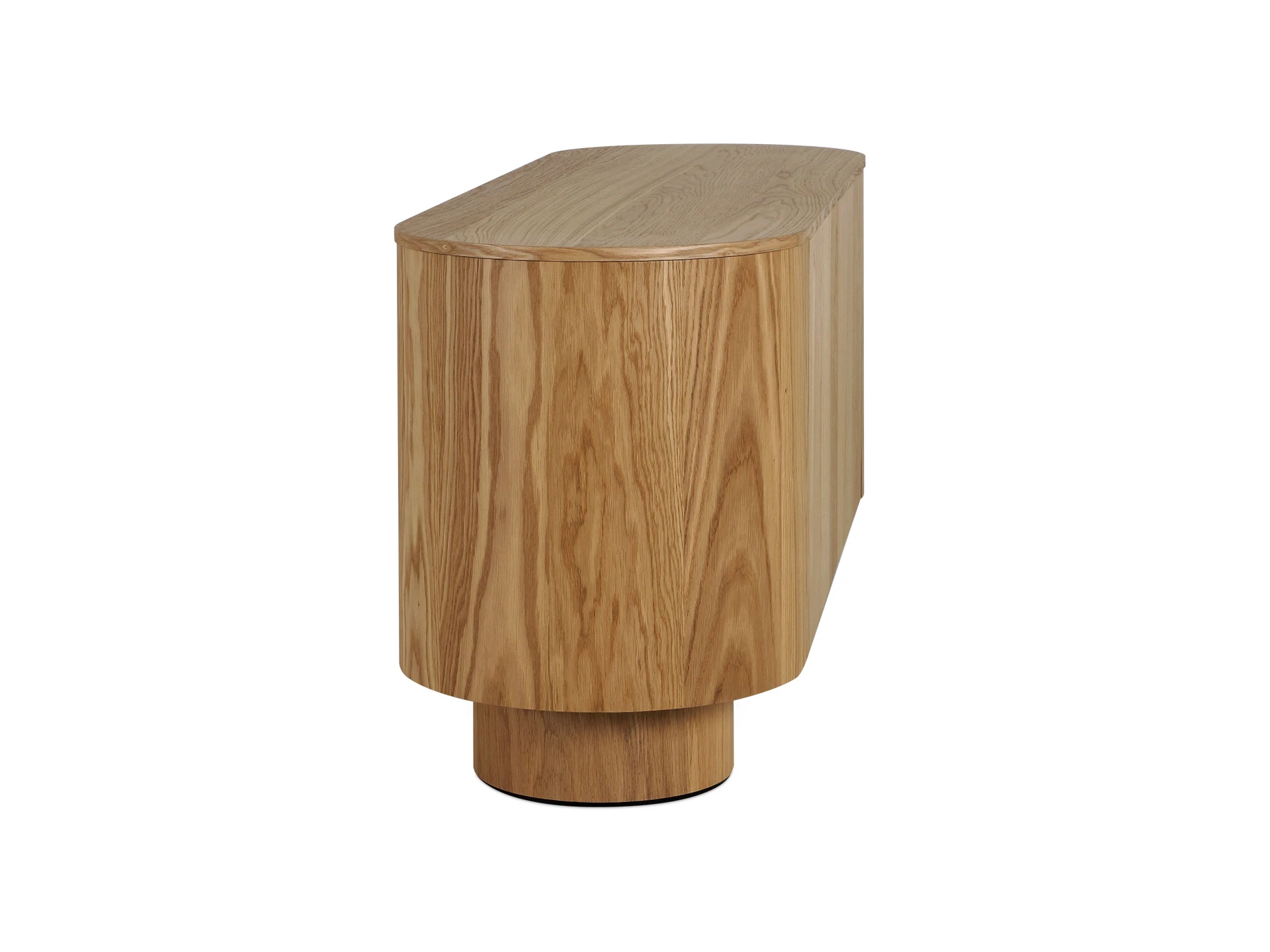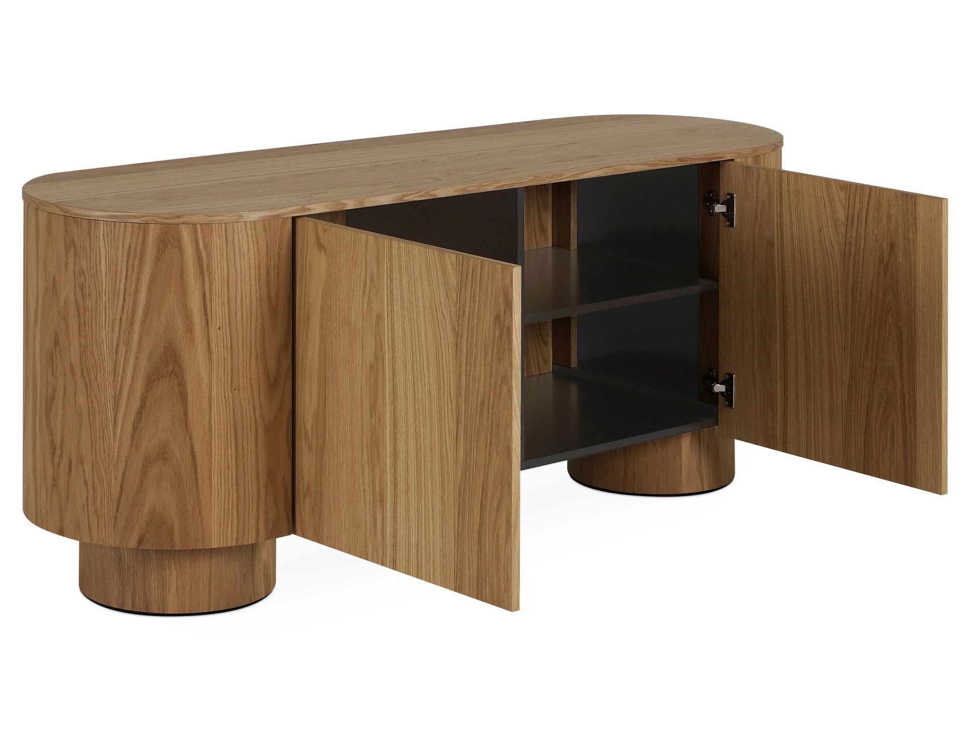 Сервант Kota сочетает в себе художественную эстетику с повседневной практичностью. Его дизайн вдохновлён самой природой с дыханием лесов и просторов полей. На двух широких круглых ножках крепко стоит основательный корпус с плавными линями. Внимание привлекает не только выразительная геометрия, но и отделка поверхности натуральным дубовым шпоном. Тёмные прожилки древесных волокон на светлом фоне сливаются в причудливые узоры, подчеркивая уникальность каждого изделия.