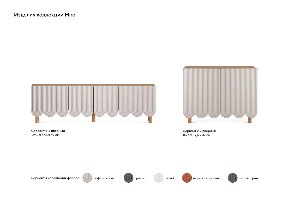 Компактные круглые ножки из бука невысоко приподнимают над полом корпус серванта. Что обеспечивает лёгкость восприятия и воздушность модели. А также простоту уборки. За дверцами скрываются 3 отсека для хранения разных предметов от техники до косметики. Сервант Mira можно использовать в качестве ТВ-консоли в гостиной, найдётся ему местечко и в спальне, рабочей или обеденной зоне. Можно дополнить органайзерами для хранения украшений, аксессуаров. Цвет фасадов может быть ярким, например, терракотовым, графитовым, или нейтральным: белым, бежевым. В любом варианте сервант Mira станет эффектным акцентом интерьера.