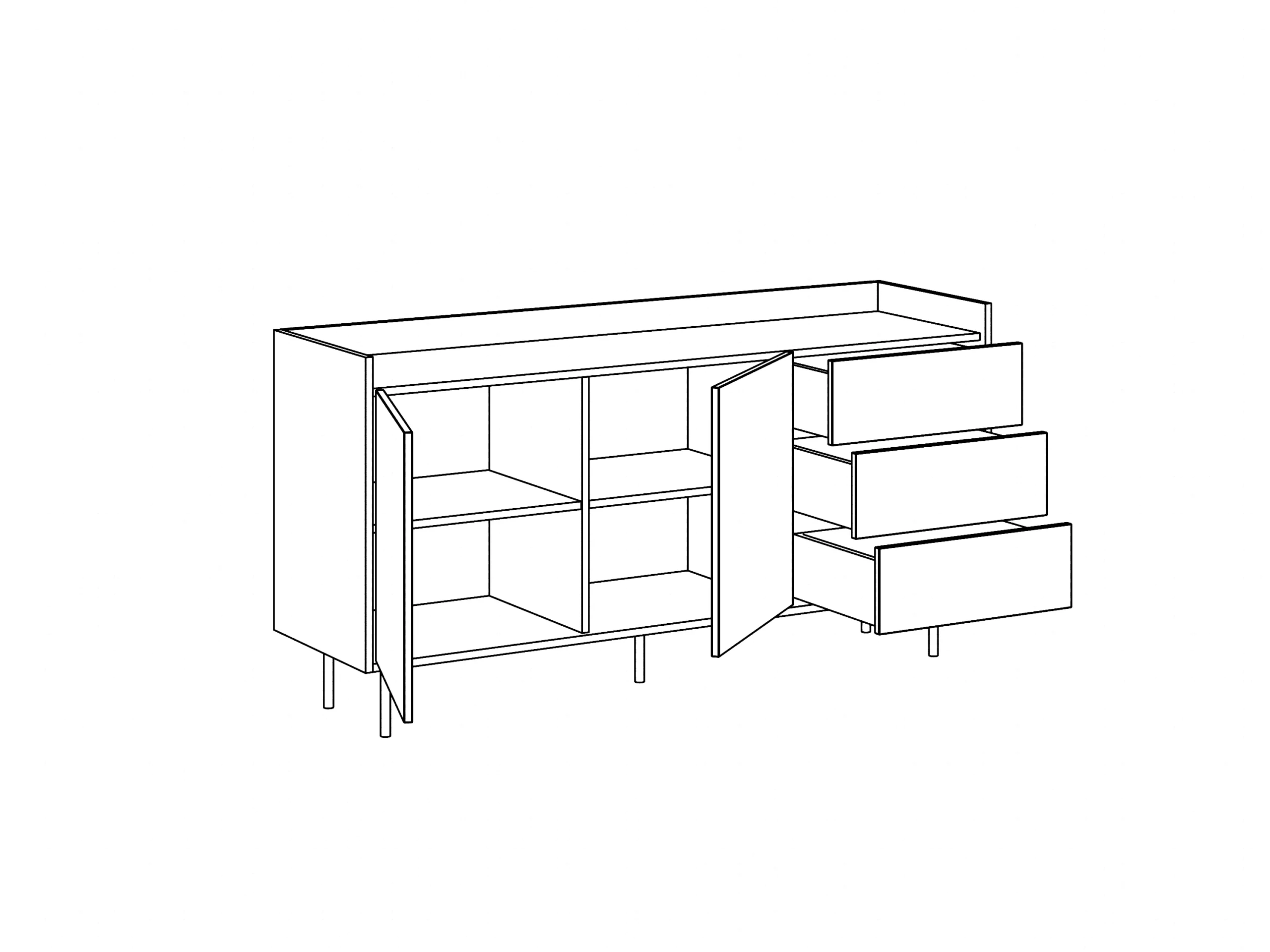 Опоры – металлические, окрашенные черной эмалью, высотой 160 мм., диаметром 20 мм., с пластиковыми подпятниками.Сервант рекомендуется крепить к стене для защиты от опрокидывания (крепежи входят в комплект).