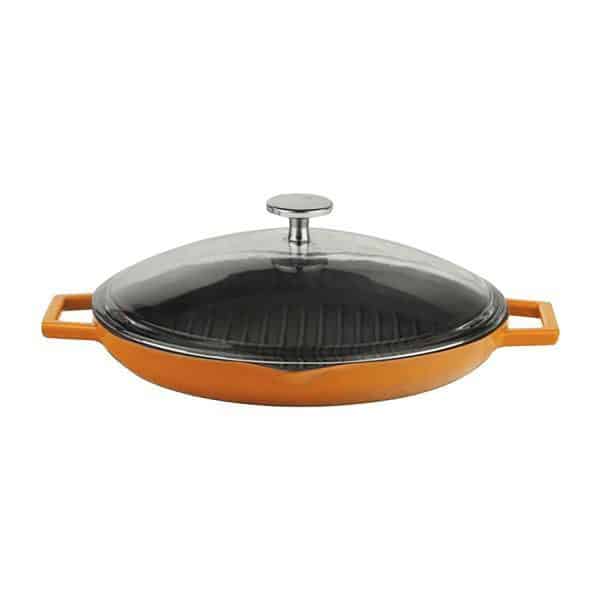 СКОВОРОДА-ГРИЛЬ Ø26, СО ВСТРОЕННЫМИ МЕТАЛЛИЧЕСКИМИ РУЧКАМИ И СТЕКЛЯННОЙ КРЫШКОЙ ОРАНЖЕВОГО ЦВЕТА