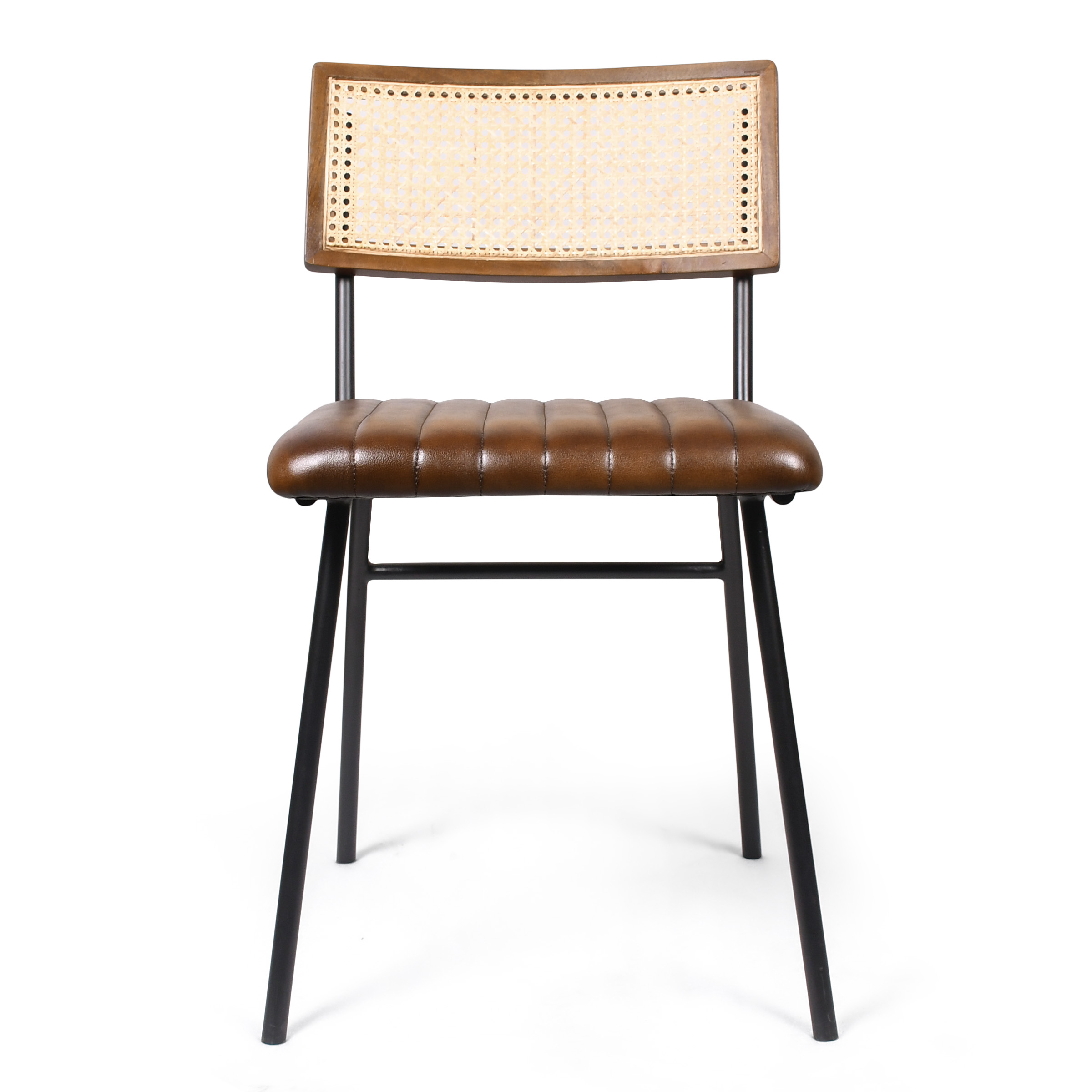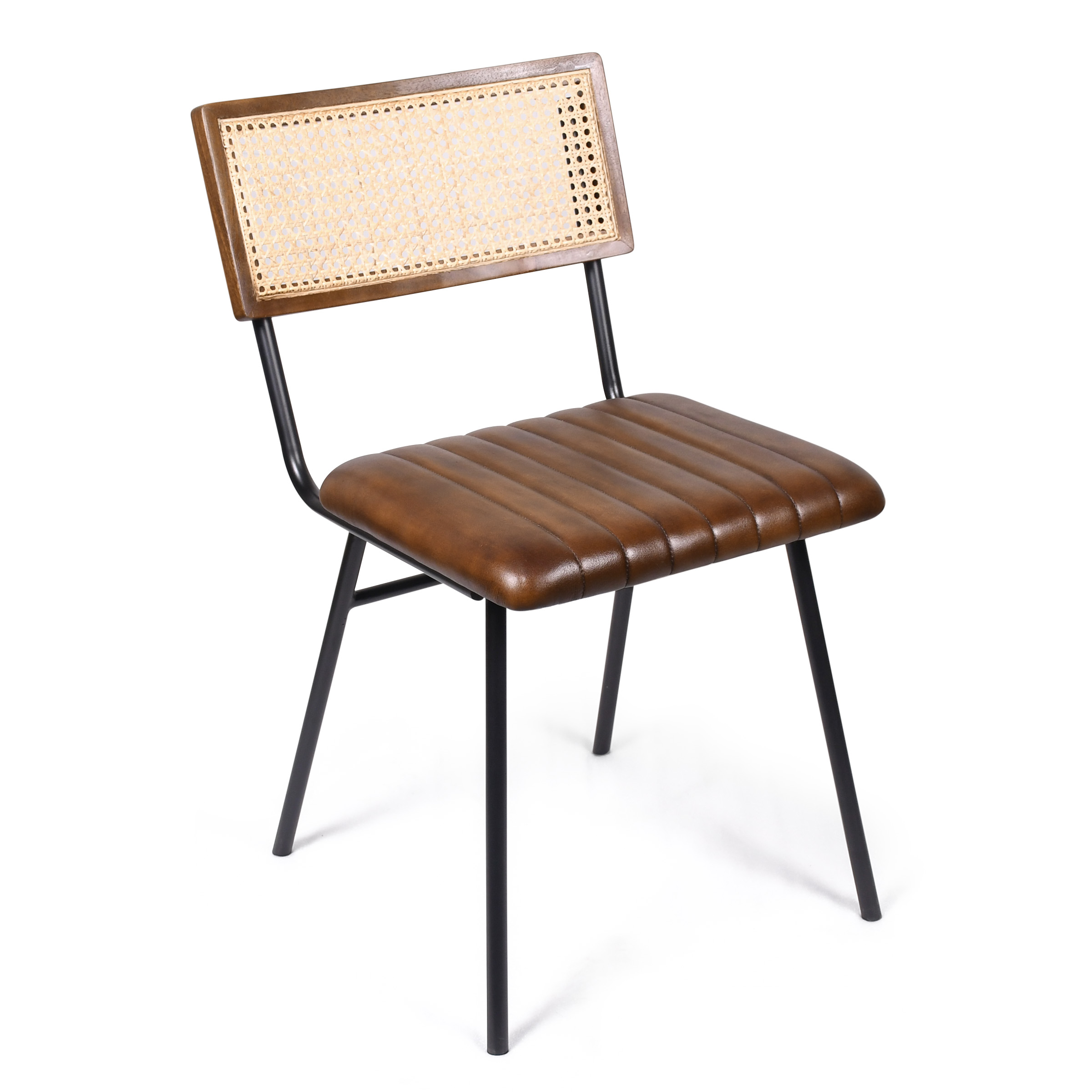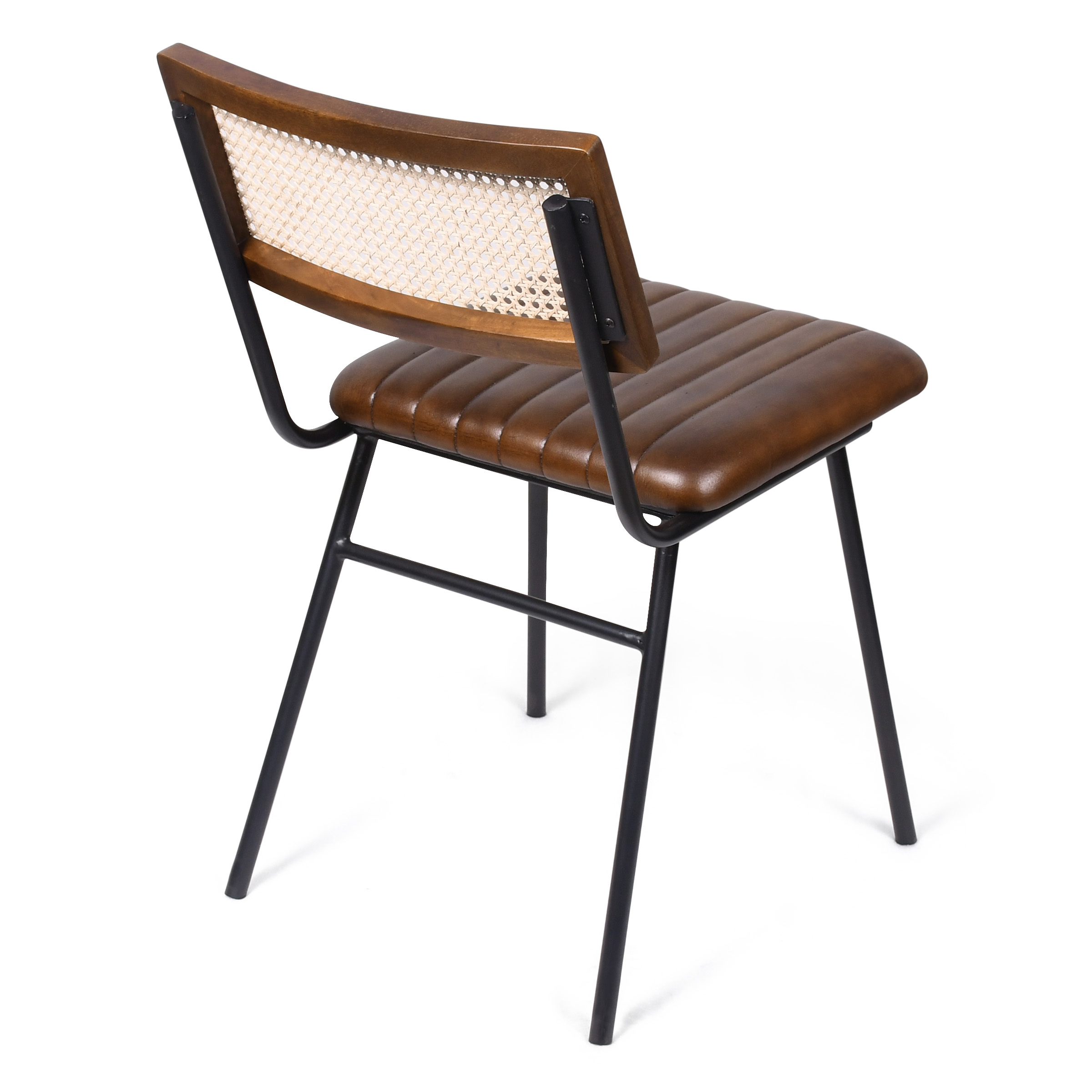 Стул, в котором современная строгость сочетается с природной теплотой. Монолитные черные металлические ножки подчеркивают геометричную форму, создавая эффект стабильности. Глубокий коричневый кожаного сиденья перекликается с древесными тонами спинки, где ажурные вставки из ротанга добавляют воздушности. Горизонтальная стяжка связывает конструкцию, обеспечивая долговечность и надежность.