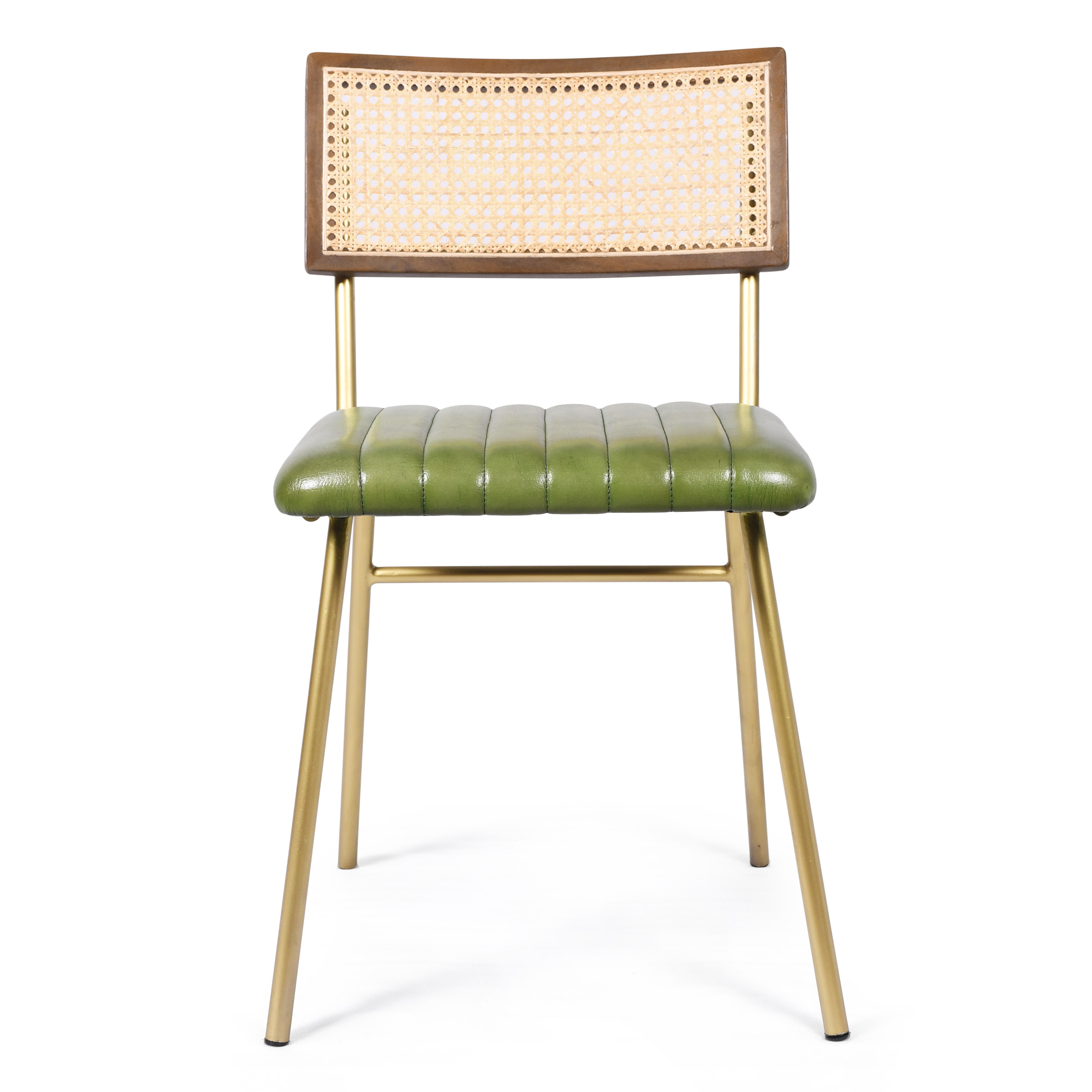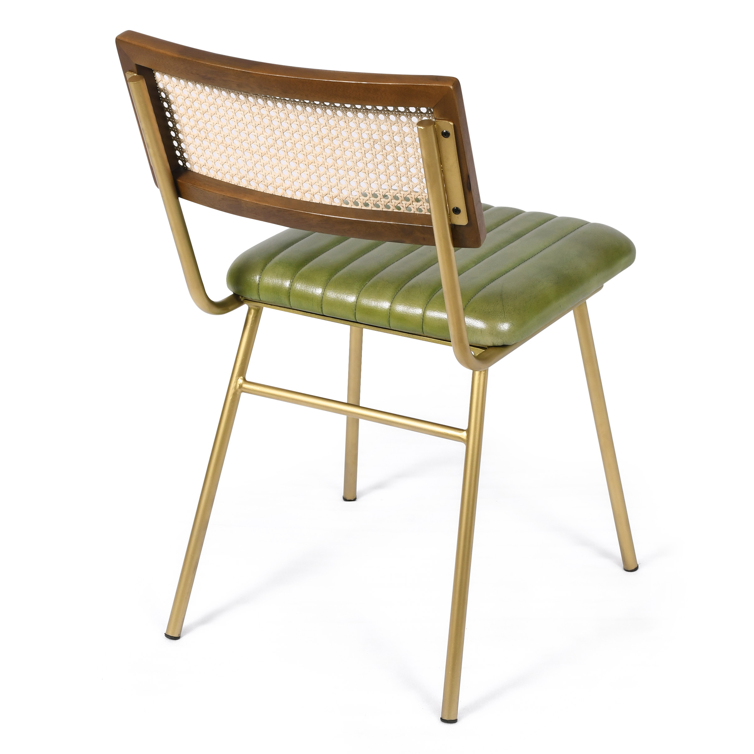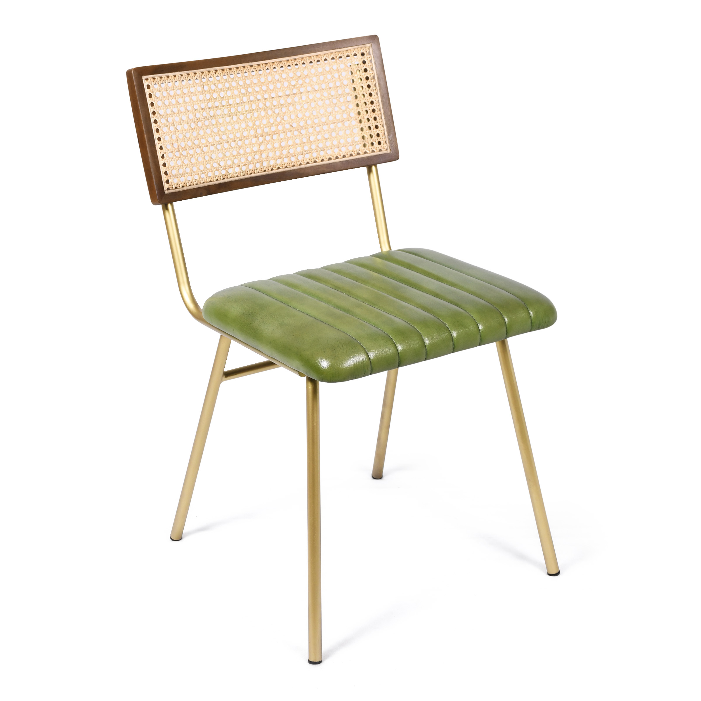 Изысканный стул, объединяющий современную эстетику с натуральной текстурой. Утонченные металлические ножки золотистого оттенка создают эффект парящей легкости, контрастируя с насыщенным зеленым кожаным сиденьем. Деревянная спинка с вставками из ротанга привносит в дизайн дыхание природы, а горизонтальная стяжка гарантирует прочность и долговечность конструкции.