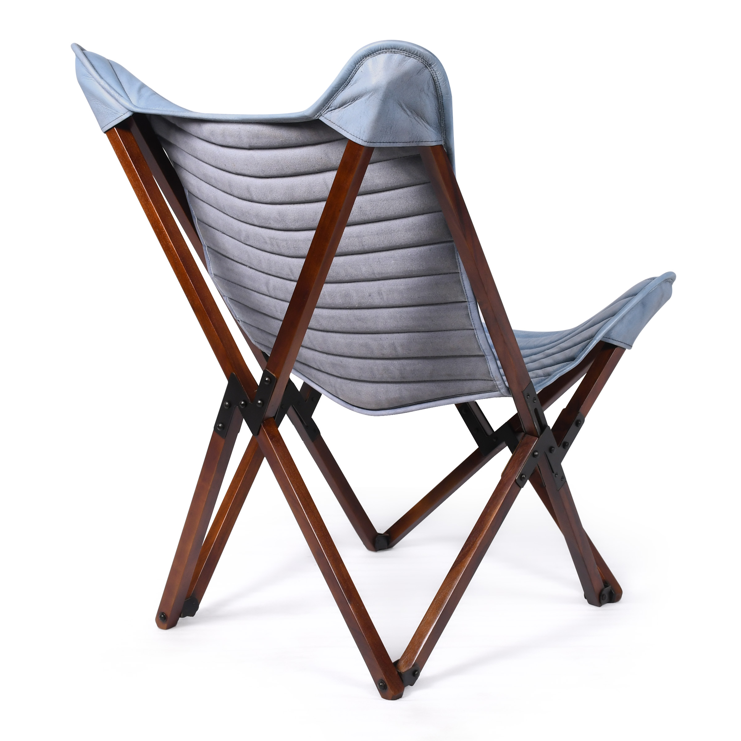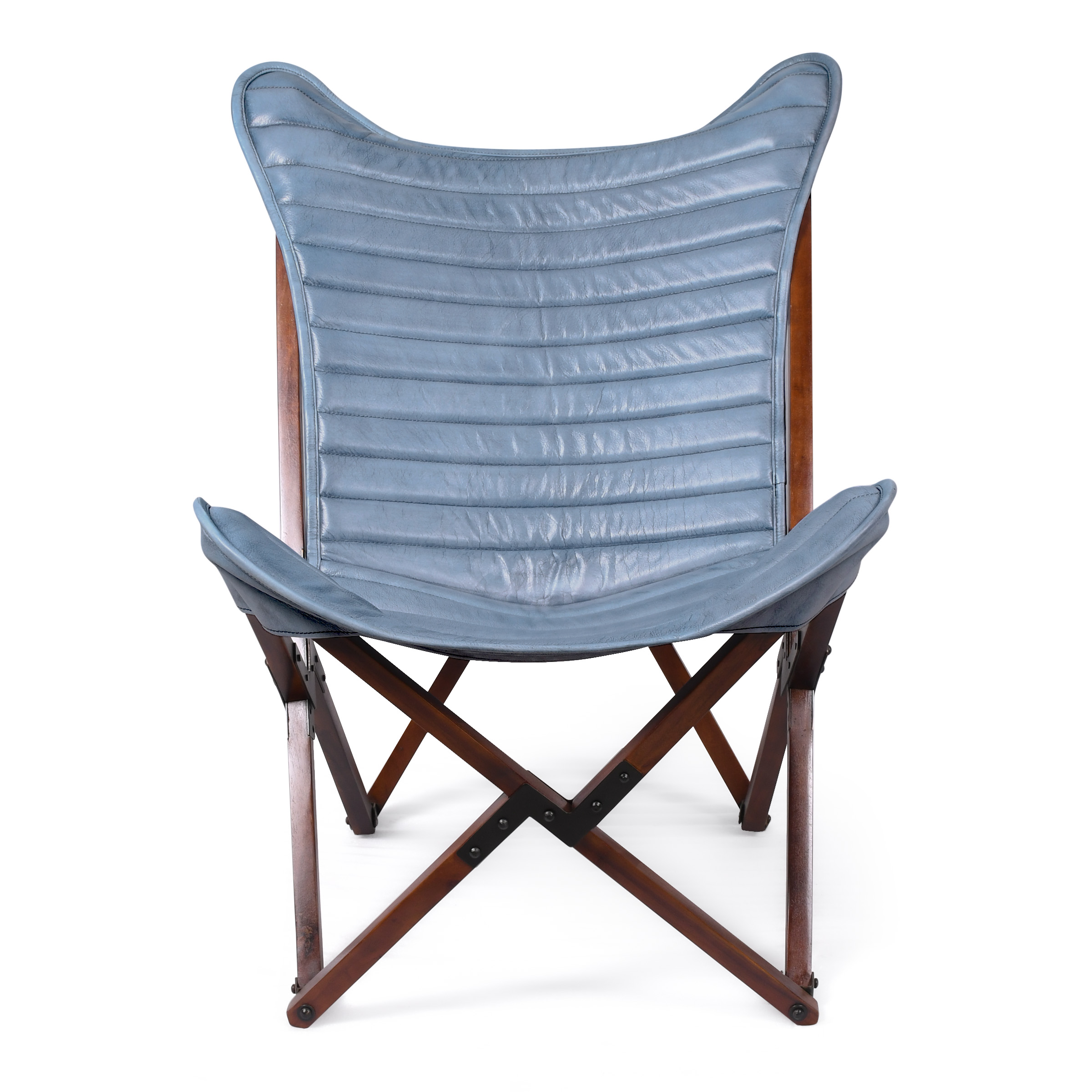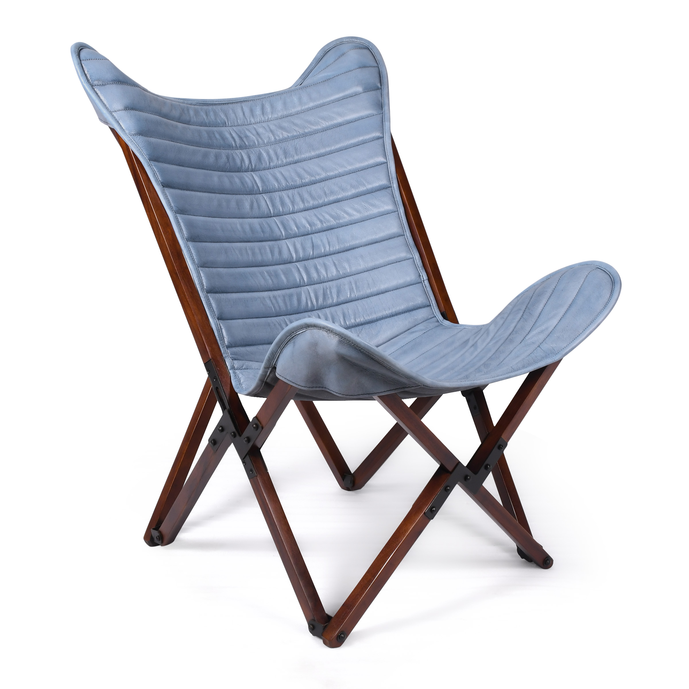 Элегантный стул-бабочка нежно-голубого цвета, где пастельный оттенок кожи гармонично сочетается с натуральным деревом каркаса. Вертикальная стяжка подчеркивает лаконичный дизайн, а глубокая посадка обеспечивает комфорт. Идеальное решение для создания легкой, свежей атмосферы в интерьере.