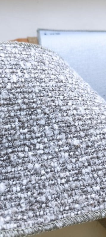 Каркас стула выполнен из массива ясеня, тонированного в цвет орех. Спинка и сиденье изготовлены из многослойной фанеры. Стул обит тканью букле в серых тонах. Наполнитель спинки и сидения — пенополиуретан высокой плотности.