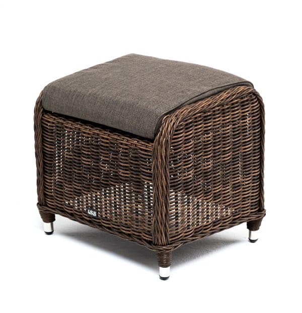 Алюминиевый каркас используется при изготовлении основы пуфа. В роли декоративного элемента выступает ручная оплетка, созданная из искусственного ротанга. Представлена в коричневом цвете.