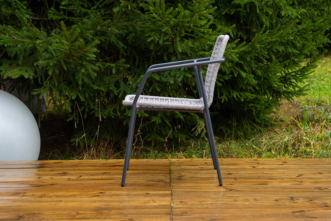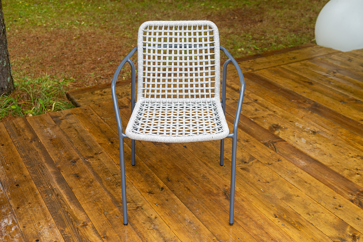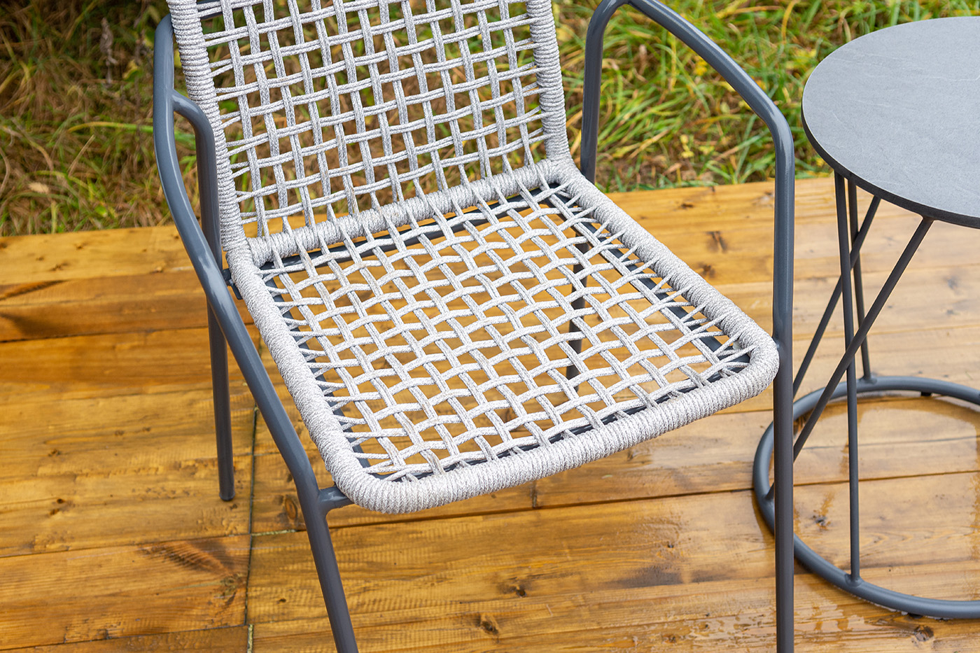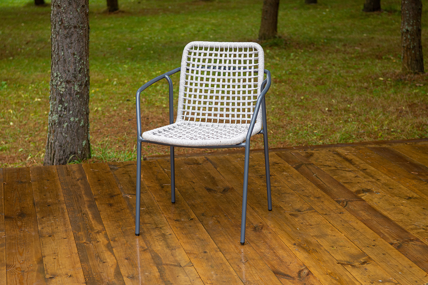 Стул «Тунис» — плетеная модель из роупа (полиэфирной веревки) с алюминиевым каркасом темно‑серого цвета (RAL7024).