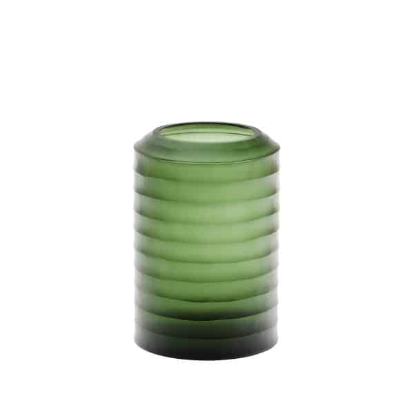Ваза полностью сделана из переработанного стекла. Она имеет цилиндрическую форму с рельефной фактурой. Благодаря неровной поверхности, цвет стекла многократно переходит от светлого к темному, что создает эффект объема.