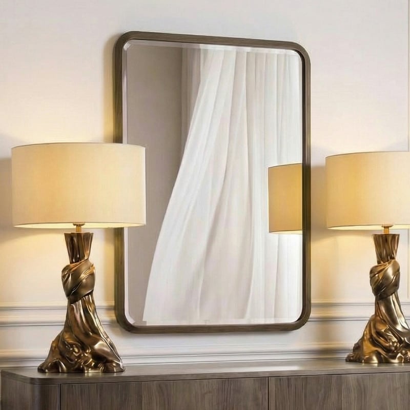 Зеркала в интерьере визуально расширяют помещение и добавляют света. Рама зеркала выполнена в отделке шпоном американского ореха.