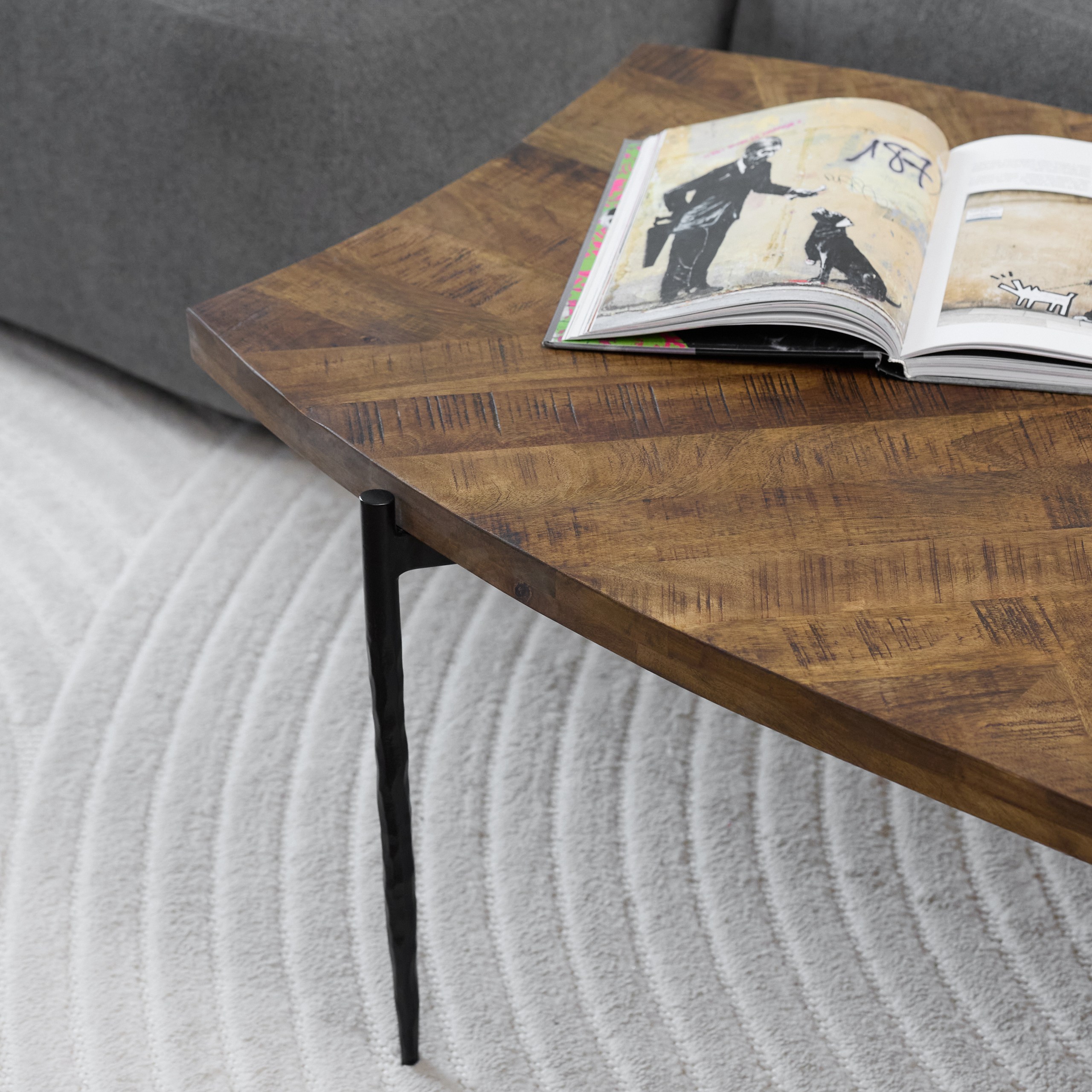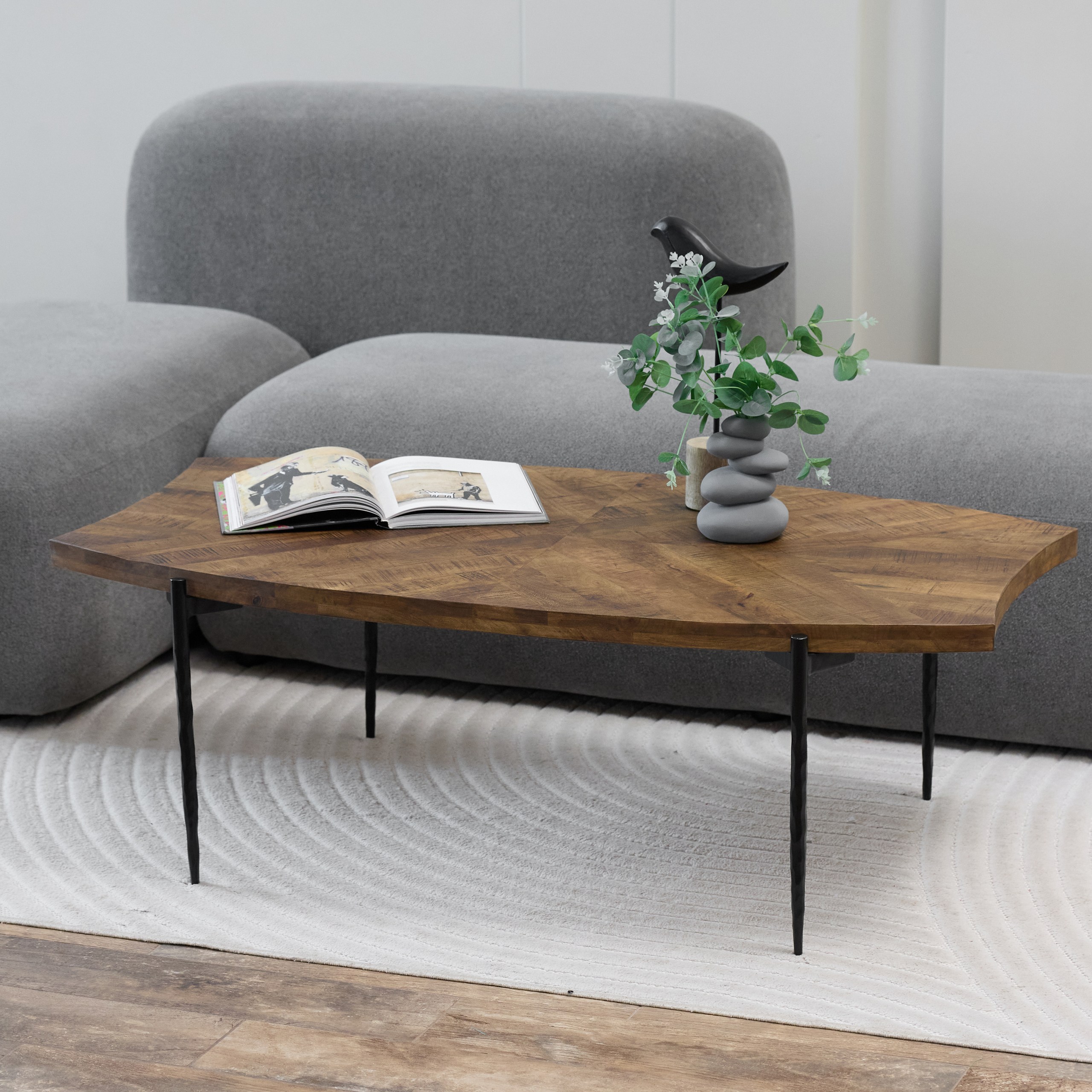 Трапециевидный журнальный стол, в котором смелая геометрия встречается с изысканной простотой. Конусообразные резные ножки чёрного цвета придают конструкции графичную лёгкость, а столешница необычной формы из тёмно-коричневого массива становится выразительным художественным акцентом. Этот стол — не просто поверхность, а элемент стиля, задающий динамику и современный ритм всему пространству.