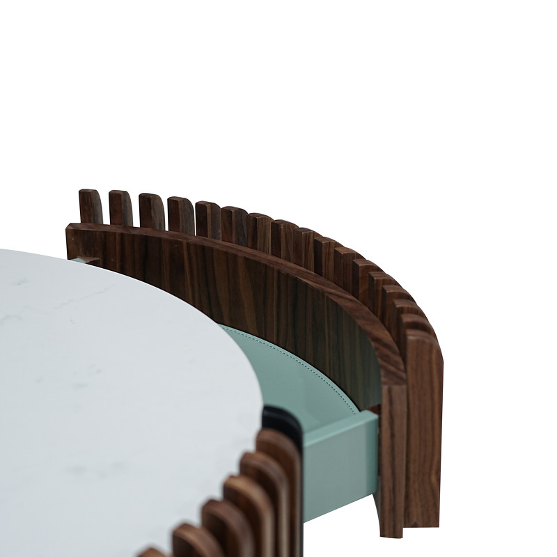Внешняя сдержанность скрывает главный сюрприз внутри. Откройте выдвижные ящики с системой push-to-open, и вашему взору откроется контрастная отделка: стенки ящиков покрыты матовым бирюзовым лаком, а сами ящики выполнены из экокожи PU 266# в цвет лака. Два ящика со скрытыми направляющими идеально подойдут для хранения пультов, гаджетов и любимых журналов.